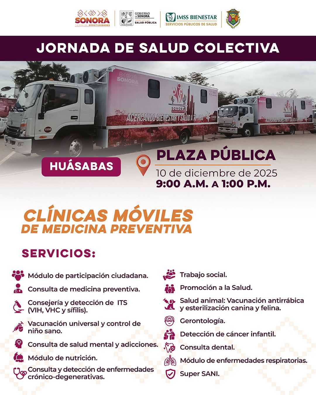 Asimismo, el martes nueve de diciembre, la Clínica Móvil estará disponible en el municipio de Bavispe, en la Plaza Hidalgo, con un horario de 14:00 a 18:00 horas, facilitando el acceso a diversos servicios preventivos y médicos para todas y todos los habitantes del municipio.