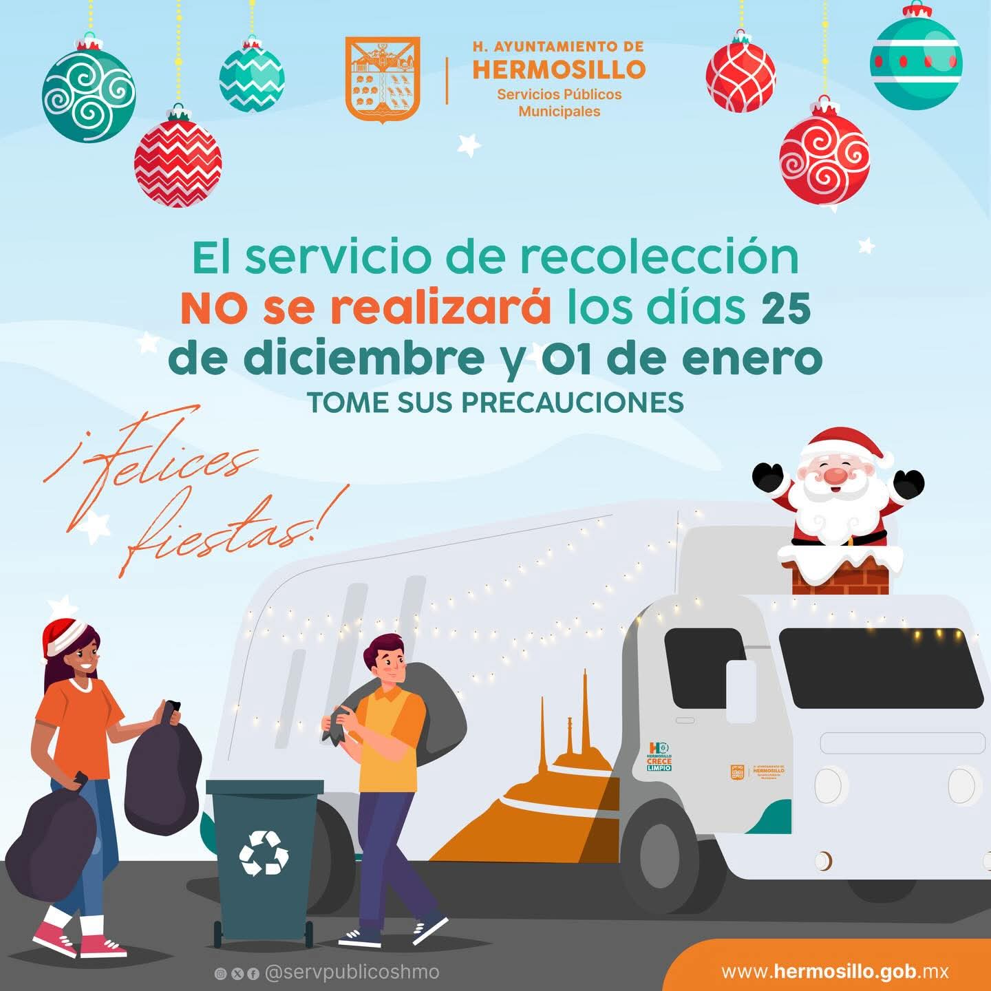 Pavlovich Escalante explicó que son los únicos días en el año en los que no se otorga el servicio por lo que sugirió a las y los hermosillenses no sacar los desechos de sus hogares en las mencionadas fechas, sino al siguiente día que toque la recolección cuando acudirán con normalidad los camiones en todas las rutas de recolección ya establecidas.