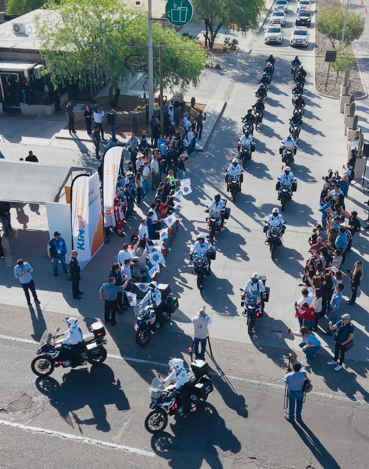 Acompañado por Jesús Alonso Durón Montaño, comisario general de la Jefatura de Policía Preventiva y Tránsito Municipal, y Juan Francisco Matty Ortega, director de Bomberos de Hermosillo, encabezó la salida de un estado de fuerza integrado por 67 patrullas policiales, 31 motocicletas y vigilancia aérea, además de unidades de la Cruz Roja Mexicana, Departamento de Bomberos y la Guardia Nacional.